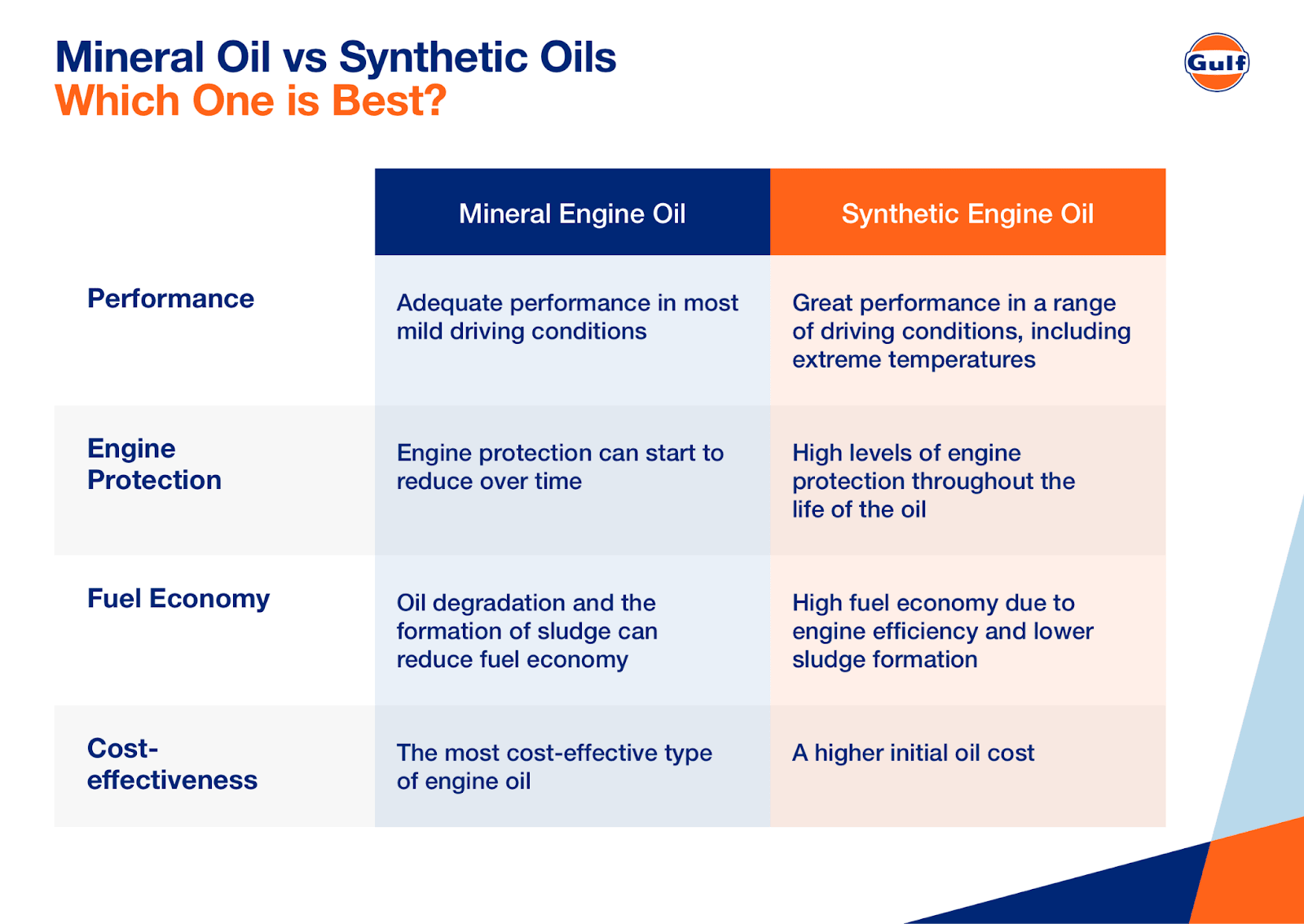 Mineral oil generally costs less to buy and might be more suitable if you drive an older vehicle and live in a mild climate, but will need changing more often and on balance it offers lower performance and less engine protection over time.